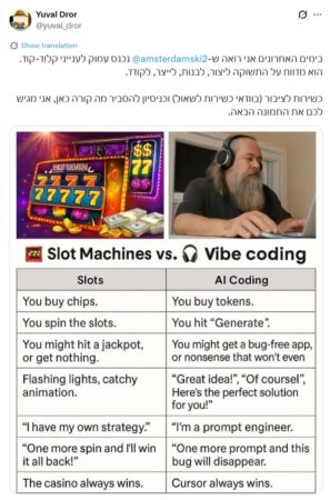 שאול, שהוא חבר, צלל לאירוע עם כל הלב ובסדרה של ציוצים הבהיר שהוא בלע את הגלולה. בתגובה, העליתי ציוץ שמשווה את חוויית הוייב-קודינג לחוויה של משחק בקזינו, ציוץ שמנסה להסביר למה אנשים נשאבים פנימה. זה לא מקרי.
